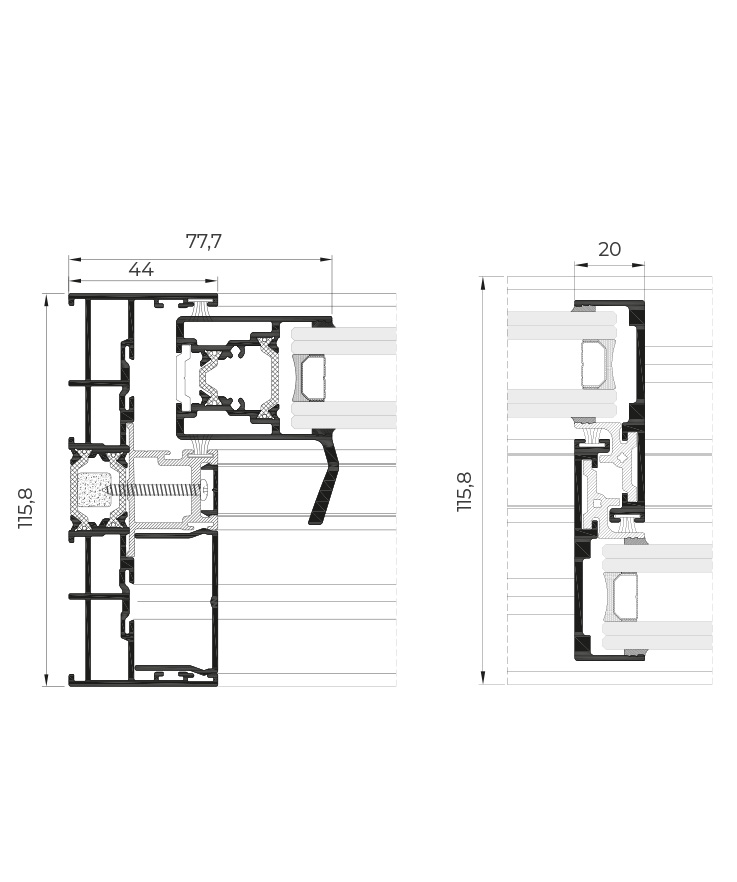 It features an elegant design with a central junction of only 20 mm and offers the possibility of concealing the frame around the perimeter. Central junction locking option that allows the sashes to be hidden within the frame from a front view. Option of concealed locking that facilitates the crossing of the sashes.